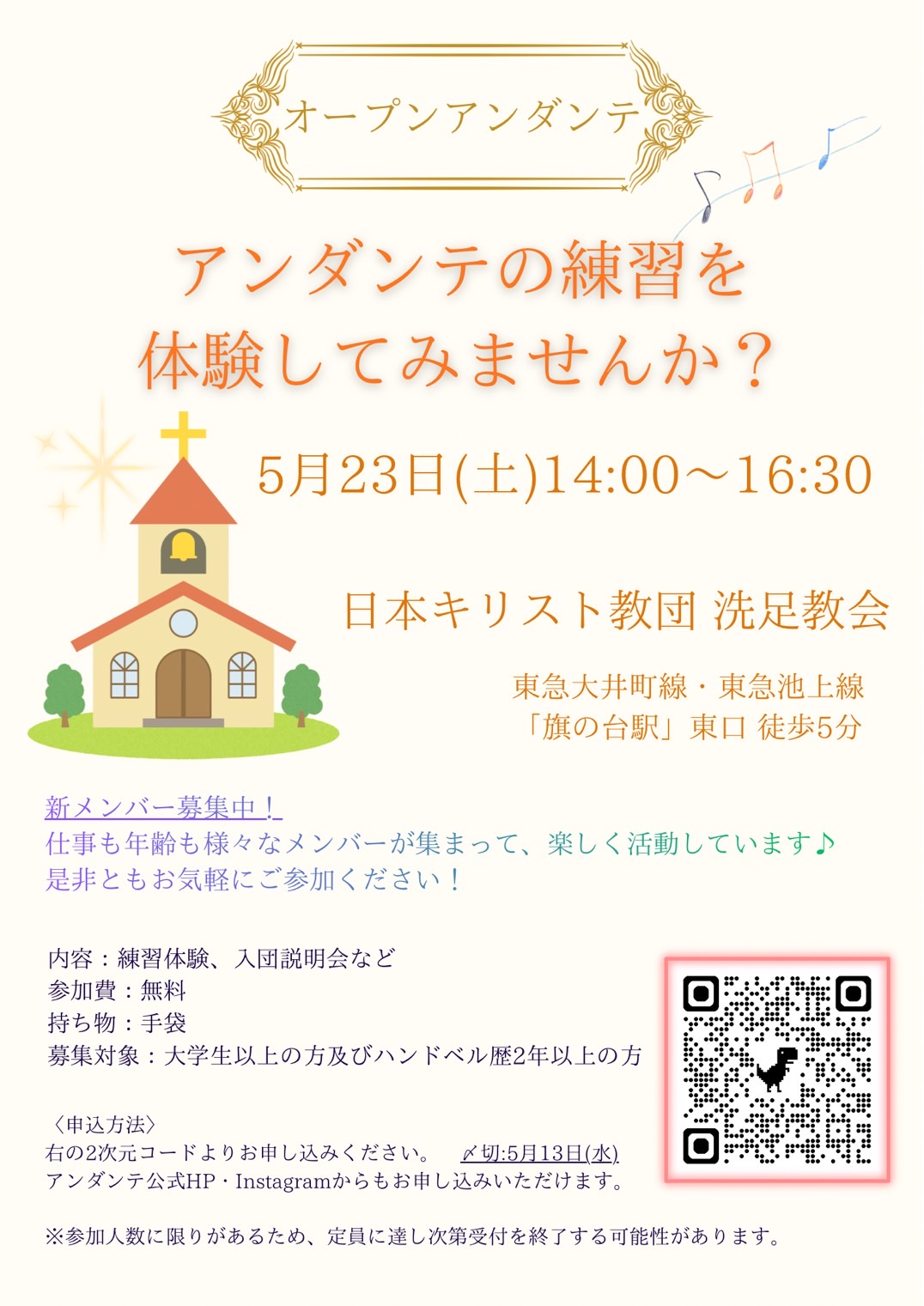 5月23日(土)にオープンアンダンテを開催いたします。アンダンテの練習を体験してみませんか?アンダンテに興味のある方はぜひお気軽にご参加ください。